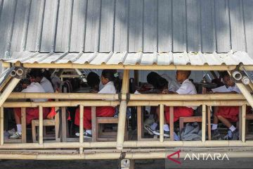 Sejumlah murid yang merupakan penyintas bencana erupsi Gunung Lewotobi Laki-laki pada 2024 belajar di ruang belajar sementara Sekolah Ceria, Desa Konga, Flores Timur, Nusa Tenggara Timur, Senin (20/10/2025). Sekolah tersebut menyediakan tujuh ruang belajar untuk 94 siswa dari dua sekolah yang terdampak parah oleh erupsi besar gunung setinggi 1.584 meter di atas permukaan laut (MDPL) pada November 2024. ANTARA FOTO/Mega Tokan/rwa.