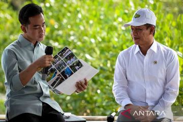 Wakil Presiden Gibran Rakabuming Raka (kiri) didampingi Menteri Lingkungan Hidup Hanif Faisol Nurofiq (kanan) melihat foto dokumentasi kegiatan aktivis lingkungan saat mengunjungi Taman Mangrove Ketapang di Mauk, Kabupaten Tangerang, Banten, Senin (27/10/2025). Dalam kunjungannya, Gibran berdialog dengan aktivis lingkungan yang berperan dalam pelestarian mangrove dan menanam bibit mangrove sebagai upaya mengembalikan ratusan ribu hektare kawasan mangrove yang telah beralih fungsi. ANTARA FOTO/Putra M. Akbar/rwa.
