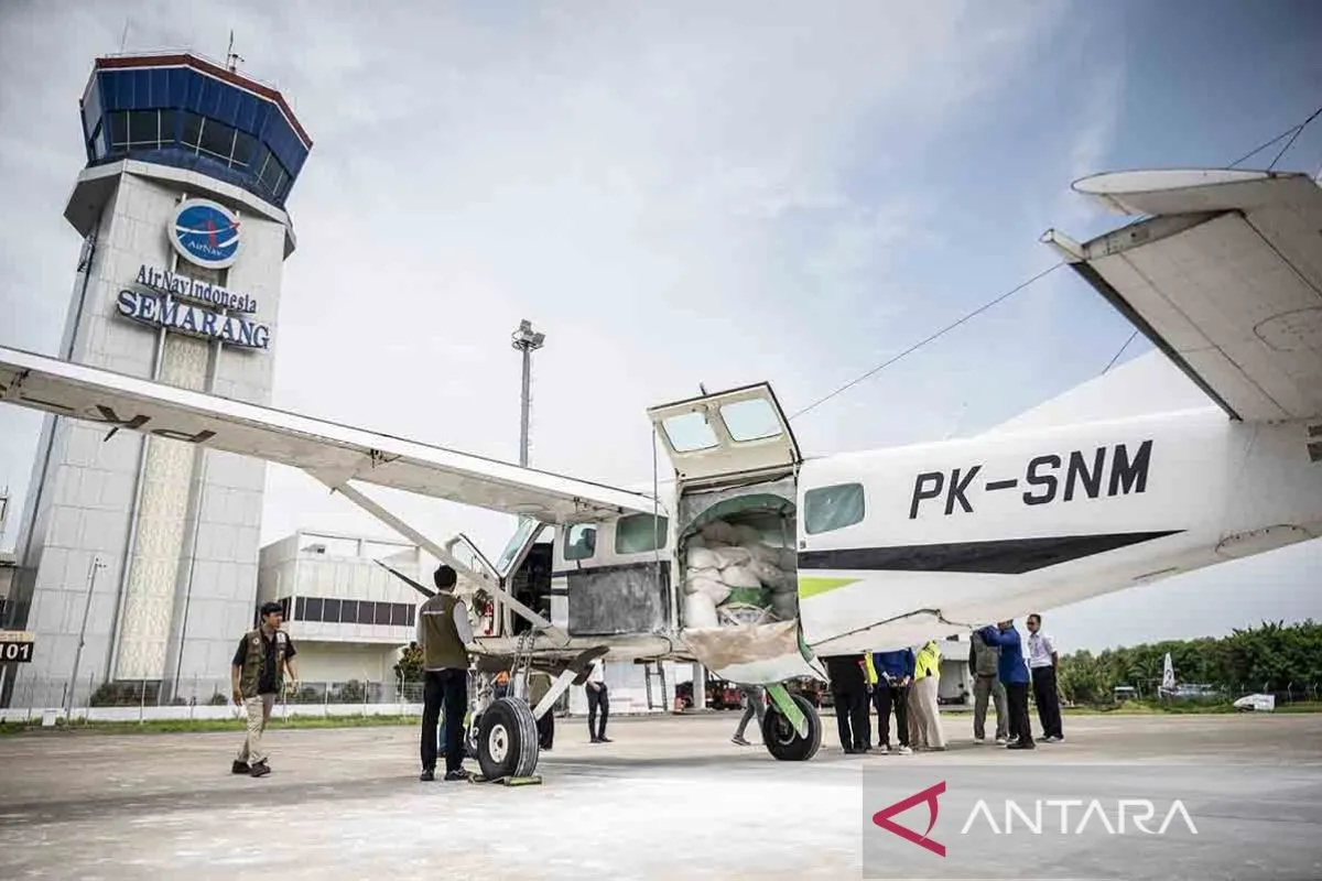 Petugas Badan Nasional Penanggulangan Bencana (BNPB) memeriksa bahan semai untuk Operasi Modifikasi Cuaca (OMC) yang telah dimuat ke dalam pesawat Cessna 208 Caravan PK-SNM di Bandara Internasional Jenderal Ahmad Yani, Semarang, Jawa Tengah, Senin (27/10/2025). BNPB bersama Badan Meteorologi Klimatologi dan Geofisika (BMKG) melaksanakan Operasi Modifikasi Cuaca (OMC) secara berkala sejak Sabtu (25/10) hingga lima hari ke depan dalam rangka penanganan bencana hidrometeorologi basah di wilayah Kota Semarang dan Kabupaten Grobogan dengan total bahan semai sebanyak 10 ton NaCl dan 2 ton CaO. ANTARA FOTO/Aprillio Akbar/rwa.