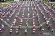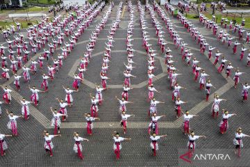 Foto udara sejumlah pelajar menampilkan tari kolosal Jaipong Galuh Rahayu pada Festival Konservasi dan Budaya Universitas Galuh (Unigal) di Alun-alun Ciamis, Jawa Barat, Selasa (28/10/2025). Kegiatan yang diikuti 517 peserta dari tingkat SMP, SMA, dan Mahasiswa Unigal itu digelar dalam rangka memperingati Hari Sumpah Pemuda yang bertujuan untuk melestarikan seni tari khas Sunda sekaligus menanamkan nilai-nilai budaya kepada generasi muda. ANTARA FOTO/Adeng Bustomi/nym.