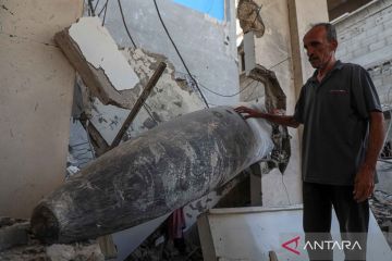 Seorang warga Palestina melihat sebuah bom yang belum meledak di dalam sebuah rumah yang hancur di kamp pengungsi Jabalia, Jalur Gaza utara, Palestina, Kamis (30/10/2025). Di Pusat Hak Asasi Manusia Gaza, sebuah organisasi sipil independen yang memantau pelanggaran memperkirakan sekitar 20.000 bom dan rudal yang belum meledak masih tersebar di seluruh Gaza dan hingga pertengahan Oktober, total puing-puing akibat penghancuran rumah dan infrastruktur vital telah mencapai antara 65 - 70 juta ton serta berisi sekitar 71.000 ton bahan peledak dan sisa-sisa perang. ANTARA FOTO/Xinhua/Rizek Abdeljawad/nym.