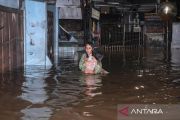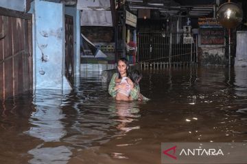 Warga menggendong anaknya menerobos banjir di Petogoan, Kebayoran Baru, Jakarta, Kamis (30/10/2025). BPBD DKI Jakarta mencatat hinga pukul 21.00 WIB sebanyak 54 RT di Jakarta Selatan dan Jakarta Timur terendam banjir akibat intensitas hujan tinggi dan luapan aliran kali. ANTARA FOTO/Sulthony Hasanuddin/tom.