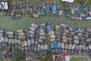 Foto udara perahu nelayan bersandar di muara Sungai Limbangan, Juntinyuat, Indramayu, Jawa Barat, Selasa (28/10/2025). Nelayan setempat mengaku sudah tidak melaut sejak sepekan terakhir akibat cuaca buruk berupa gelombang tinggi dan angin kencang di perairan Laut Jawa. ANTARA FOTO/Dedhez Anggara/tom.