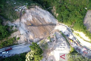 Foto udara petugas menggunakan alat berat mengangkat material longsor di Olele, Kabupaten Bone Bolango, Gorontalo, Jumat (31/10/2025). Longsor material tanah dan batu dari lereng bukit tersebut menutupi jalan trans Sulawesi bagian selatan hingga menyebabkan antrean panjang kendaraan yang melintas di daerah itu. ANTARA FOTO/Adiwinata Solihin/tom.