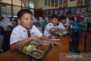 Siswa menyantap makan program Makan Bergizi Gratis (MBG) khas Minang dari SPPG Polda Sumatera Barat di SDN Percobaan, Padang, Senin (3/11/2025). SPPG Polda Sumbar bersama Yayasan Kemala Bhayangkari menyiapkan menu Nusantara khas Minang yakni ayam balado dan lotek untuk MBG yang didistribusikan kepada sedikitnya 1.283 penerima manfaat. ANTARA FOTO/Iggoy el Fitra/tom.
