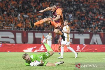 Pesepak bola Borneo FC Samarinda Mariano Peralta (atas) melompat saat menghindari penjaga gawang Dewa United Banten FC Sonny Ricardo Marciano Stevens (bawah) dalam lanjutan BRI Super League 2025/2026 di Stadion Segiri Samarinda, Kalimantan Timur, Rabu (5/11/2025). Borneo FC Samarinda berhasil menang dengan skor akhir 4-0. ANTARA FOTO/M Risyal Hidayat/nym.
