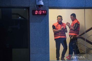 Tersangka selaku Bupati Ponorogo Sugiri Sancoko (kiri) bersama Sekretaris Daerah (Sekda) Kabupaten Ponorogo Agus Pramono (kanan) berjalan untuk dihadirkan dalam konferensi pers di gedung Merah Putih KPK, Jakarta, Minggu (9/11/2025). Dari hasil operasi tangkap tangan, KPK menetapkan dan menahan Bupati Ponorogo Sugiri Sancoko, Sekda Agus Pramono, Direktur RSUD Harjono Kabupaten Ponorogo Yunus Mahatma, dan pihak swasta Sucipto sebagai tersangka terkait kasus dugaan suap pengurusan jabatan, dugaan suap proyek pekerjaan di RSUD Ponorogo dan gratifikasi di lingkungan Pemerintah Kabupaten Ponorogo. ANTARA FOTO/Muhammad Adimaja/YU