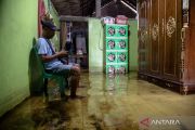 Seorang warga mengakses gawai pintar di dalam rumahnya yang tergenang banjir di Desa Sayung, Kecamatan Sayung, Kabupaten Demak, Jawa Tengah, Rabu (5/11/2025). Banjir dampak dari curah hujan tinggi di wilayah itu diperparah dengan kondisi geografis di kawasan hilir sungai dan daerah cekung, sehingga menyebabkan tujuh dari delapan dusun di desa tersebut tergenang banjir bervariasi setinggi sekitar 10-75 sentimeter sejak Rabu (22/10). ANTARA FOTO/Aji Styawan/nym.