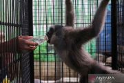 Petugas memberikan air minum kepada seekor Owa Jawa (Hylobates moloch) hasil serahan warga di Kantor Balai Besar Konservasi Sumber Daya Alam (BBKSDA) Jawa Barat Seksi Konservasi Wilayah I, Kota Serang, Banten, Selasa (4/11/2025). BBKSDA Jawa Barat Seksi Konservasi Wilayah I mengevakuasi primata dilindungi berjenis kelamin jantan berumur sekitar 1,5 tahun dengan berat sekitar dua kilogram tersebut dalam kondisi sehat yang kemudian akan direhabilitasi sebelum dilepasliarkan ke habitat asalnya. ANTARA FOTO/Angga Budhiyanto/nym.