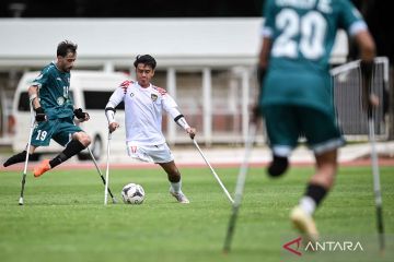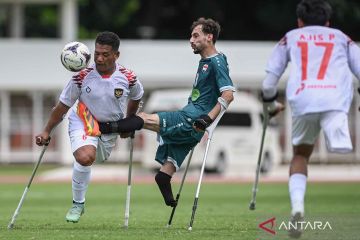 Pesepak bola Timnas Amputasi Indonesia Ajis Pirmansyah (kedua kiri) berebut bola dengan pesepak bola Timnas Amputasi Irak Mustafa Khalid (kiri) dalam pertandingan fase grup Kualifikasi Piala Dunia Sepak Bola Amputasi 2026 Zona Asia di Stadion Madya, Kompleks GBK, Senayan, Jakarta, Senin (10/11/2025). Timnas Sepak Bola Amputasi Indonesia kalah dengan skor 0-1. ANTARA FOTO/Fauzan/nym.