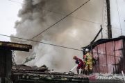Foto udara petugas pemadam kebakaran berusaha memadamkan titik api yang membakar pabrik vulkanisir ban di Genuk, Semarang, Jawa Tengah, Selasa (11/11/2025). Dinas Pemadam Kebakaran Kota Semarang mengerahkan empat unit mobil pemadam kebakaran untuk memadamkan api yang terjadi sejak pukul 08.30 WIB, sementara penyebab kebakaran masih dalam proses penyelidikan pihak berwenang. ANTARA FOTO/Aprillio Akbar/bar