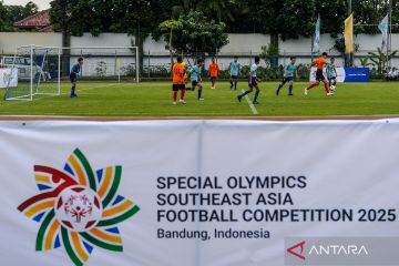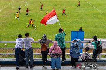 Penonton menyaksikan pertandingan sepak bola babak pengelompokan Kompetisi Disabilitas Intelektual antara tim disabilitas intelektual putri Indonesia (kuning) melawan tim disabilitas intelektual putri Malaysia (merah) di Stadion Sidolig, Bandung, Jawa Barat, Selasa (11/11/2025). Special Olympics Southeast Asia menggelar kompetisi sepak bola tujuh pemain yang diikuti 132 atlet disabilitas intelektual dari enam negara Asia Tenggara untuk memberikan kesempatan bagi mereka meraih prestasi di bidang olahraga. ANTARA FOTO/Raisan Al Farisi/bar