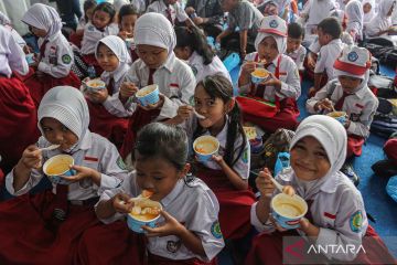 Sejumlah siswa menyantap makanan bakso dari olahan ikan dalam Grakan Gemar Makan Ikan Central Java Fish Market #4 di Kantor Gubenur Jateng, Semarang, Jawa Tengah, Selasa (11/11/2025). Kegiatan yang diinisiasi Pemprov Jateng berkolaborasi dengan Bank Indonesia dengan membagikan gratis sebanyak 1.000 porsi bakso dari bahan olahan ikan kepada pelajar tersebut untuk mengampanyekan kepada masyarakat tentang pentingnya konsumsi ikan guna mencegah stunting sekaligus membentuk generasi yang sehat, kuat, dan cerdas. ANTARA FOTO/Makna Zaezar/YU