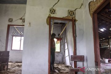 Kondisi tembok rumah retak akibat pergerakan tanah di Desa Sukajaya, Kabupaten Ciamis, Jawa Barat, Rabu (12/11/2025). Bencana pergerakan tanah yang terjadi sejak April 2025 meluas dan menyebabkan sebanyak 16 rumah rusak, serta 19 KK atau 47 jiwa terpaksa mengungsi ke lokasi yang lebih aman. ANTARA FOTO/Adeng Bustomi/sgd