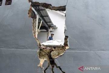 Warga memperlihatkan tembok rumah retak akibat pergerakan tanah di Desa Sukajaya, Kabupaten Ciamis, Jawa Barat, Rabu (12/11/2025). Bencana pergerakan tanah yang terjadi sejak April 2025 meluas dan menyebabkan sebanyak 16 rumah rusak, serta 19 KK atau 47 jiwa terpaksa mengungsi ke lokasi yang lebih aman. ANTARA FOTO/Adeng Bustomi/sgd