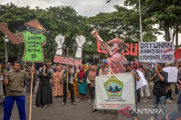 Sejumlah perwakilan petani, mahasiswa, masyarakat sipil, dan aktivis lingkungan yang tergabung dalam Persatuan Gerakan Rakyat Tani (Pager Tani) Jateng membawa atribut saat aksi damai Jateng Lumbung Kriminalisasi di depan Mapolda Jateng, Semarang, Jawa Tengah, Senin (17/11/2025). Dalam aksi di depan Mapolda Jateng dan Kompleks Kantor Gubernur Jateng itu mereka menyerukan sejumlah tuntutan, di antaranya penghentian kriminalisasi terhadap enam petani dan tiga pejuang lingkungan hidup yang diduga dikriminalisasi saat memperjuangkan lahan pertanian mereka dari konflik agraria terhadap sejumah perusahaan di Jepara, Pati, dan Kendal, serta mendorong kepolisian untuk menggunakan UU Anti-SLAPP tentang Perlindungan dan Pengelolaan Lingkungan Hidup karena para petani dan aktivis berjuang agar wilayah Jateng terhindar dari segala bentuk kerusakan lingkungan yang menimbulkan bencana alam. ANTARA FOTO/Aji Styawan/rwa.