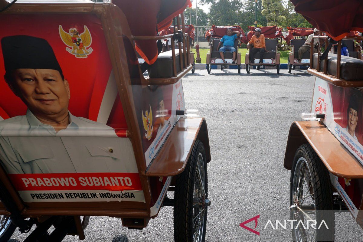 Pengemudi becak melihat becak listrik atau betrik bantuan Presiden Prabowo Subianto di Pendopo Kabupaten Jombang, Jawa Timur, Senin (24/11/2025). Presiden Prabowo melalui Yayasan Yayasan Gerakan Solidaritas Nasional (GSN) memberikan bantuan becak listrik kepada pengemudi becak lansia sebanyak 100 unit di Kabupaten Jombang dengan harapan bisa membantu perekonomian masyarakat terutama mereka yang berusia lanjut. ANTARA FOTO/Syaiful Arif/tom.