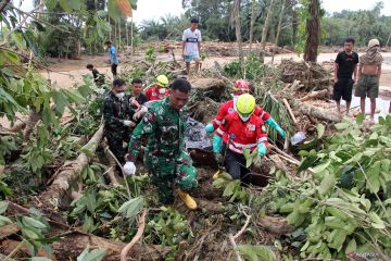 Tim SAR gabungan mengevakuasi korban banjir bandang di Desa Aek Garoga, Kecamatan Batang Toru, Kabupaten Tapanuli Selatan, Sumatera Utara, Jumat (28/11/2025). BPBD Tapanuli Selatan mencatat hingga Jumat (28/11) sebanyak 32 orang meninggal dunia akibat banjir bandang pada Selasa (25/11). ANTARA FOTO/Yudi Manar/foc.