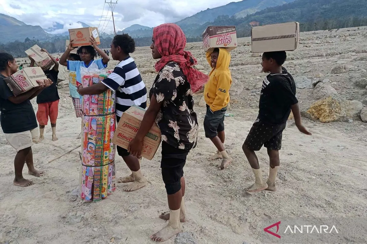 Warga Kampung Pobiatma korban banjir dan longsor membawa bantuan dari pemerintah di Distrik Asotipo, Kabupaten Jayawijaya, Papua Pegunungan, Rabu (10/12/2025). Banjir dan tanah longsor melanda Kampung Pobiatma pada Minggu (7/12) malam yang dipicu curah hujan tinggi di wilayah tersebut hingga menyebabkan akses Jalan Trans Wamena-Kurima sementara tidak dapat dilalui karena tertutup material lumpur, tanah, dan bebatuan. ANTARA FOTO/Yudhi Efendi/YU