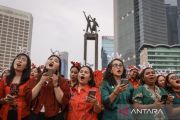 Peserta menyanyikan lagu Natal saat mengikuti Christmas Carol Colossal di kawasan Bundaran HI, Jakarta, Kamis, (11/12/2025). Pemprov DKI Jakarta menyiapkan sejumlah acara untuk menyemarakkan Natal 2025 seperti Christmas Carol Colossal dan Jakarta Light Festival yang digelar mulai 11 Desember 2025 hingga 9 Januari 2026. ANTARA FOTO/Dhemas Reviyanto/tom.