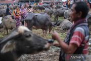 Peternak melakukan transaksi jual beli kerbau di Pasar Bolu Rantepao, Kabupaten Toraja Utara, Sulawesi Selatan, Minggu (14/12/2025). Pasar kerbau Toraja yang digelar setiap enam hari sekali itu merupakan pusat penjualan kerbau yang dijadikan hewan persembahan dalam upacara adat di wilayah itu. ANTARA FOTO/Andry Denisah/nym.