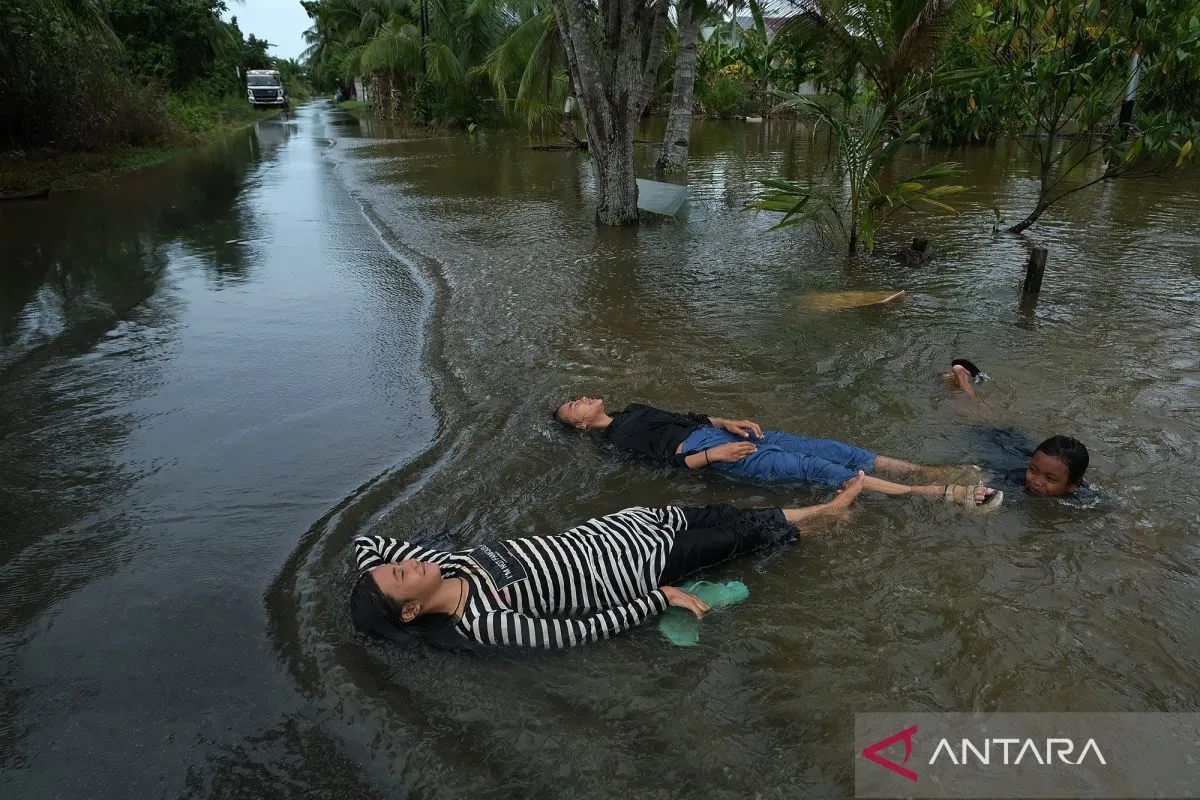 Tiga remaja bersantai di ruas jalan yang terendam banjir di Kecamatan Sungai Kakap, Kabupaten Kubu Raya, Kalimantan Barat, Selasa (9/12/2025). Polsek Sungai Kakap mencatat sebanyak 9.192 kepala keluarga (KK) di tujuh desa Kecamatan Sungai Kakap yang terdampak banjir rob, yakni Desa Tanjung Saleh, Sepok Laut, Punggur Kapuas, Sungai Kakap, Punggur Besar, Rengas Kapuas, dan Sungai Itik yang berada di sekitar aliran sungai. ANTARA FOTO/Jessica Wuysang/bar