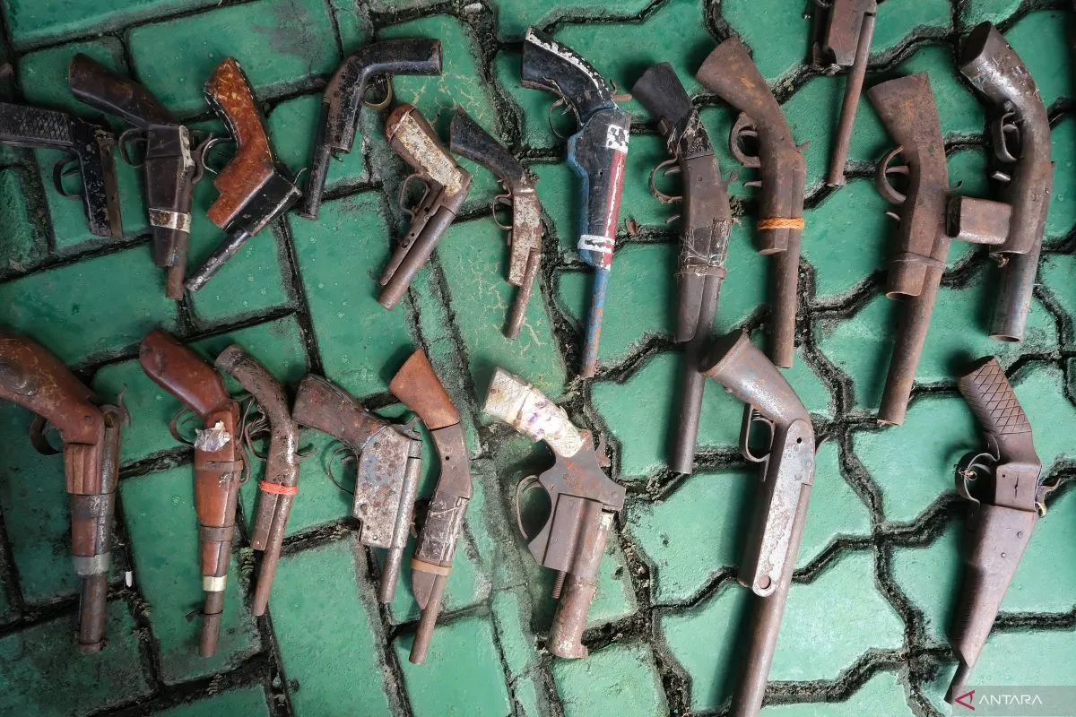 Sejumlah senjata api laras pendek dihamparkan untuk dimusnahkan di Kodam XII/Tanjungpura, Kabupaten Kubu Raya, Kalimantan Barat, Kamis (18/12/2025). Kodam XII/Tanjungpura memusnahkan 1.173 pucuk senjata api rakitan yang terdiri atas 89 pucuk pistol dan 1.084 pucuk senjata api laras panjang hasil penggalangan dari masyarakat di daerah perbatasan Indonesia-Malaysia melalui kegiatan pembinaan teritorial selama periode 2020-2025 sebagai upaya menjaga keamanan dan ketertiban wilayah. ANTARA FOTO/Jessica Wuysang/foc.