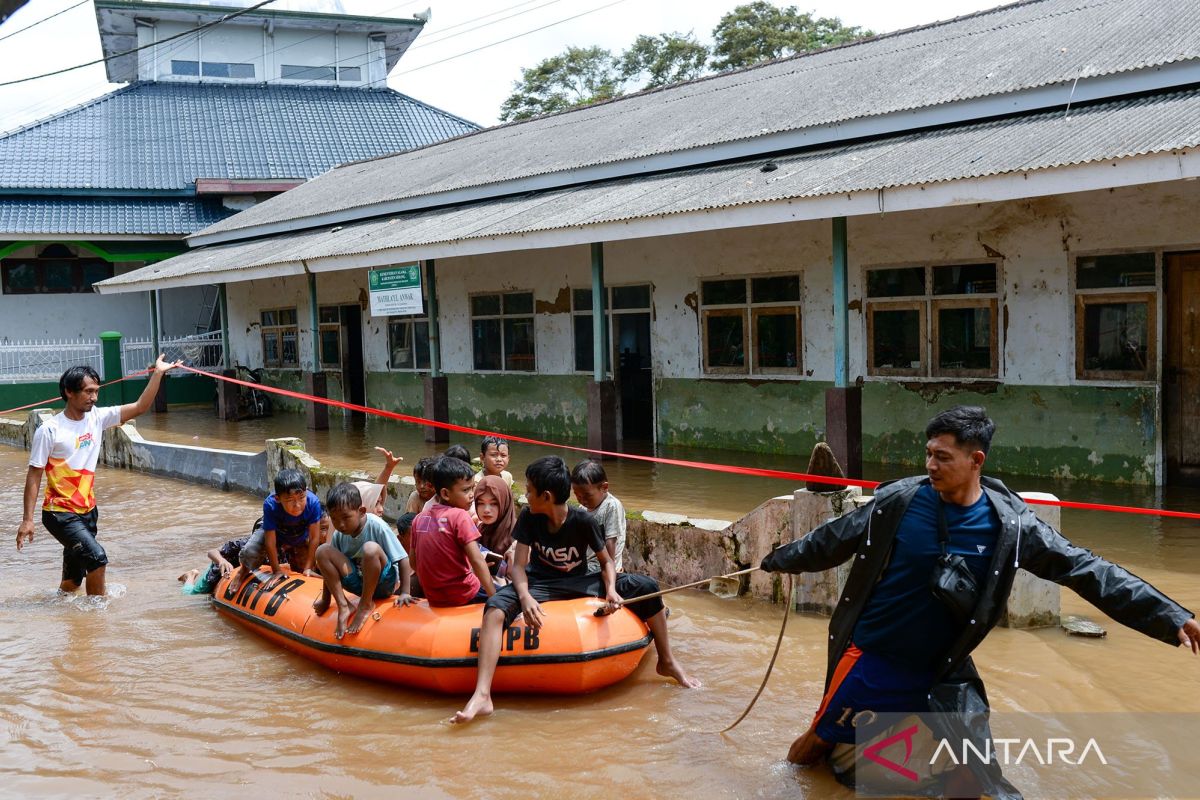 Sejumlah warga dan anak menaiki perahu karet saat banjir di Kampung Sukamaju, Padarincang, Kabupaten Serang, Banten, Jumat (19/12/2025). BPBD Kabupaten Serang mencatat hingga Jumat (19/12) daerah terdampak banjir meluas di enam kecamatan dari hari sebelumnya hanya tiga kecamatan, dengan ketinggian air 50cm hingga mencapai satu meter. ANTARA FOTO/Muhammad Bagus Khoirunas/bar