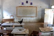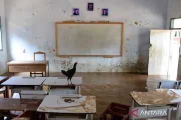 Seekor ayam bertengger di atas meja saat banjir di Madrasah Mathlaul Anwar Sukamaju, Padarincang, Kabupaten Serang, Banten, Jumat (19/12/2025). BPBD Kabupaten Serang mencatat hingga Jumat (19/12) daerah terdampak banjir meluas di enam kecamatan dari hari sebelumnya hanya tiga kecamatan, dengan ketinggian air 50cm hingga mencapai satu meter. ANTARA FOTO/Muhammad Bagus Khoirunas/bar