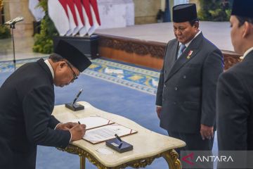 Presiden Prabowo Subianto (kanan) menyaksikan penandatanganan berita acara pelantikan Duta Besar Luar Biasa dan Berkuasa Penuh (LBBP) RI untuk Papua Nugini Okto Dorinus Manik (kiri) di Istana Negara, Jakarta, Jumat (19/12/2025). Presiden Prabowo Subianto melantik Yusron Bahauddin Ambary sebagai Duta Besar LBBP untuk Aljazair, Okto Dorinus Manik sebagai Duta Besar LBBP untuk Papua Nugini merangkap Kepulauan Solomon, Hari Prabowo sebagai Duta Besar LBBP untuk Thailand merangkap United Nations Economic and Social Commission for Asia and the Pacific (UN-ESCAP), Nurmala Kartini Pandjaitan Sjahrir sebagai Duta Besar LBBP untuk Jepang merangkap Federasi Mikronesia, Gina Yoginda sebagai Duta Besar LBBP untuk Korea Utara, Rediyanto Heru Nurcahyo sebagai Duta Besar LBBP untuk Republik Slowakia. ANTARA FOTO/Galih Pradipta/bar