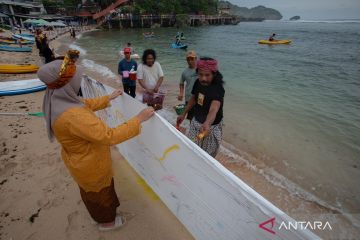 Seniman Nasirun (ketiga kanan) melukis saat aksi lukis kanvas sepanjang 100 meter On The Rock, Pantai Drini, Gunung Kidul, D.I Yogyakarta, Jumat (19/12/2025). Aksi melukis itu menjadi salah satu media pengenalan potensi wisata di Gunung Kidul. ANTARA FOTO/Andreas Fitri Atmoko/agr