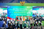 Presiden Prabowo Subianto (keenam kiri) didampingi Menteri Perumahan dan Kawasan Permukiman (PKP) Maruarar Sirait (keempat kanan) berfoto bersama warga penerima KPR FLPP pada acara akad massal Rumah Subsidi Menyala di Perumahan Pondok Banten Indah, Kota Serang, Banten, Sabtu (20/12/2025). Kementerian Perumahan dan Kawasan Permukiman (PKP) menggelar akad massal program Kredit Pemilikan Rumah (KPR) Fasilitas Likuiditas Pembiayaan Perumahan (FLPP) untuk 50.030 unit rumah subsidi yang menjadi akad massal terbesar dalam sejarah Indonesia sebagai upaya percepatan program perumahan nasional untuk masyarakat berpenghasilan rendah (MBR). ANTARA FOTO/Muhammad Bagus Khoirunas/agr