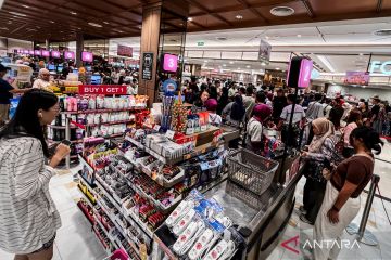 Pengunjung melintasi informasi diskon produk di DP Mall Semarang, Jawa Tengah, Minggu (28/12/2025). Pemerintah menargetkan total belanja masyarakat hingga akhir 2025 mencapai Rp110 triliun yang diharapkan dapat terealisasi melalui rangkaian program diskon nasional di pusat perbelanjaan maupun platform daring. ANTARA FOTO/Aprillio Akbar/wpa.