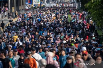 Warga berolahraga saat Hari Bebas Kendaraan Bermotor (HBKB) di kawasan Bundara HI, Jakarta, Minggu (4/1/2026). HBKB atau Car Free Day (CFD) perdana pada 2026 tersebut dimanfaatkan masyarakat untuk berolahraga dan berekreasi sekaligus mendukung upaya pengurangan polusi udara di Jakarta. ANTARA FOTO/Bayu Pratama S/YU