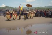 Abdi Dalem Keraton Yogyakarta membawa sesajen untuk dilabuh ke pantai saat ritual Labuhan di Pantai Parangkusumo, Bantul, D.I Yogyakarta, Senin (19/1/2026). Upacara adat yang digelar setiap tanggal 29 bulan Rajab pada kalender Jawa tersebut untuk memperingati bertahtanya Raja Keraton Yogyakarta Sri Sultan HB X selama 37 tahun pada tanggal 7 Maret 2026. ANTARA FOTO/Hendra Nurdiyansyah/tom.