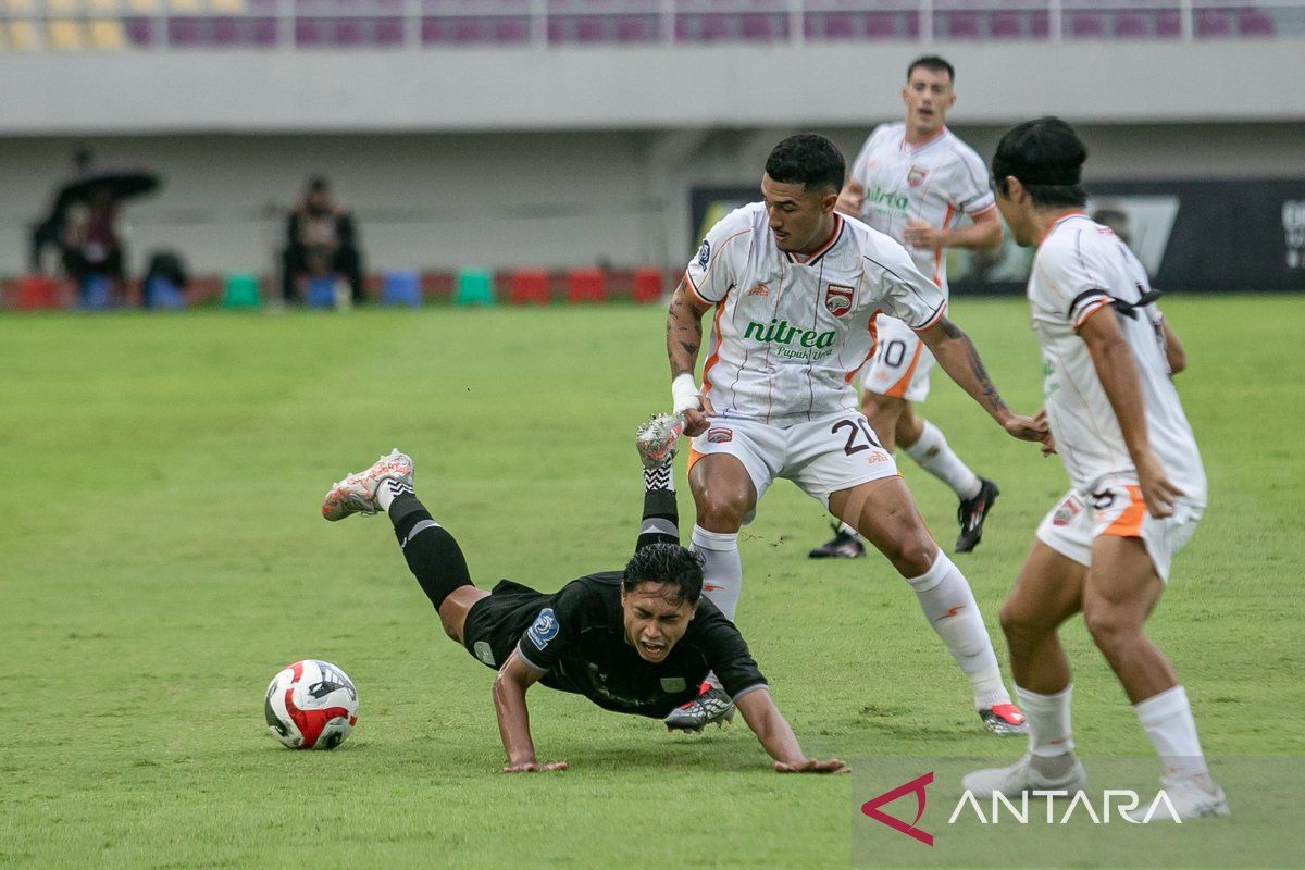 Pesepak bola Borneo FC Samarinda Mariano Ezequiel Peralta Bauer (kanan) berebut bola dengan pesepak bola Persis Solo Althaf Indie Alrizky (kiri) pada pertandingan BRI Super League 2025-2026 di Stadion Manahan, Solo, Jawa Tengah, Jumat (23/1/2026). Borneo FC Samarinda menang atas Persis Solo dengan skor 1-0. ANTARA FOTO/Mohammad Ayudha/tom.