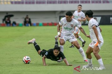 Pesepak bola Borneo FC Samarinda Juan Felipe Villa Ruiz (kanan) berebut bola dengan pesepak bola Persis Solo Alfriyanto Nico Saputro (kiri) pada pertandingan BRI Super League 2025-2026 di Stadion Manahan, Solo, Jawa Tengah, Jumat (23/1/2026). Borneo FC Samarinda menang atas Persis Solo dengan skor 1-0. ANTARA FOTO/Mohammad Ayudha/tom.