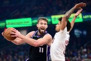 Pebasket Sacramento Kings Domantas Sabonis (kiri) melewati pebasket Cleveland Cavaliers Craig Porter Jr. dalam laga NBA di Rocket Arena, Cleveland, Ohio, AS, Jumat (23/1/2026). Kings memimpin sementara di paruh waktu dengan skor 71-68. ANTARA FOTO/IMAGN IMAGES via Reuters Connect/Ken Blaze/foc.