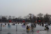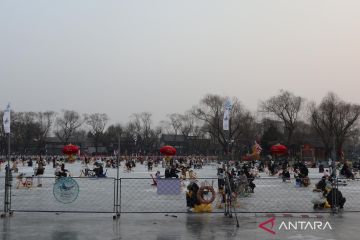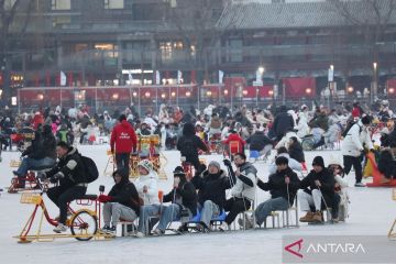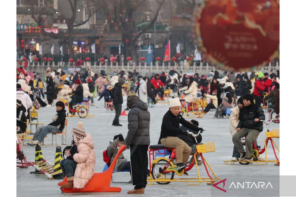 Pengunjung bermain seluncur es menggunakan kereta es dan sepeda es di kawasan Danau Shichahai yang airnya membeku akibat suhu dingin di Beijing, China, Rabu (28/01/2026). Dengan membayar 100 RMB (sekitar Rp240 ribu) per orang, pengunjung dapat melakukan berbagai aktivitas di arena es seluas 35 ribu meter persegi tersebut maupun berkeliling kawasan perumahan tradisional Beijing (hutong) di sekitar Shichahai sambil mengenakan kostum hanfu. ANTARA FOTO/Desca Lidya Natalia/wsj.