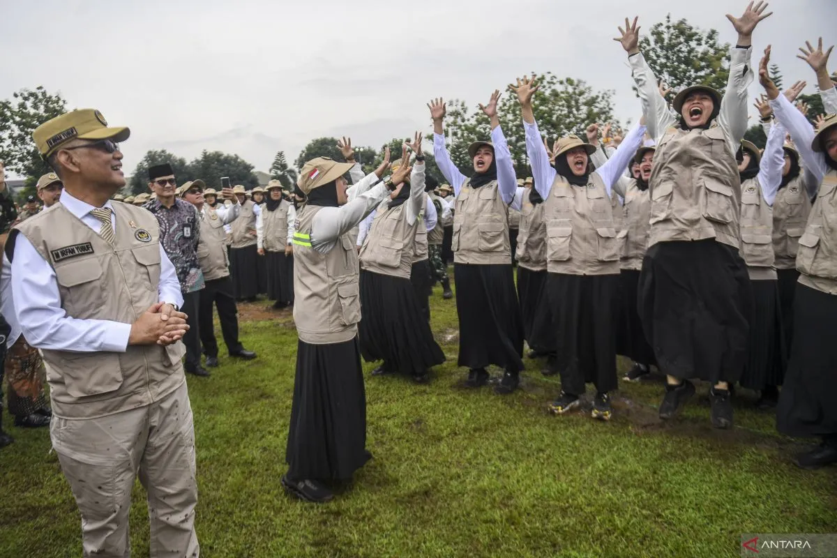 Menteri Haji dan Umrah Mochamad Irfan Yusuf (kiri) menyaksikan Petugas Penyelenggara Ibadah Haji (PPIH) Arab Saudi 2026 meneriakaan yelyel usai upacara penutupan pembekalan peseta diklat PPIH Arab Saudi 2026 di Lapangan Galaxy, Halim Perdanakusuma, Jakarta Timur, Jumat (30/1/2026). Sebanyak 1.600 PPIH Arab Saudi 2026 telah menjalani diklat selama 20 hari agar menguasai berbagai bidang layanan krusial seperti layanan transportasi, akomodasi, konsumsi, perlindungan jemaah, disabilitas dan lansia, media center, kesehatan, serta bimbingan ibadah. ANTARA FOTO/Galih Pradipta/foc.