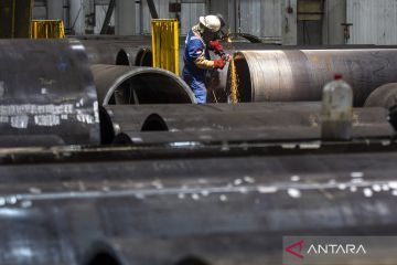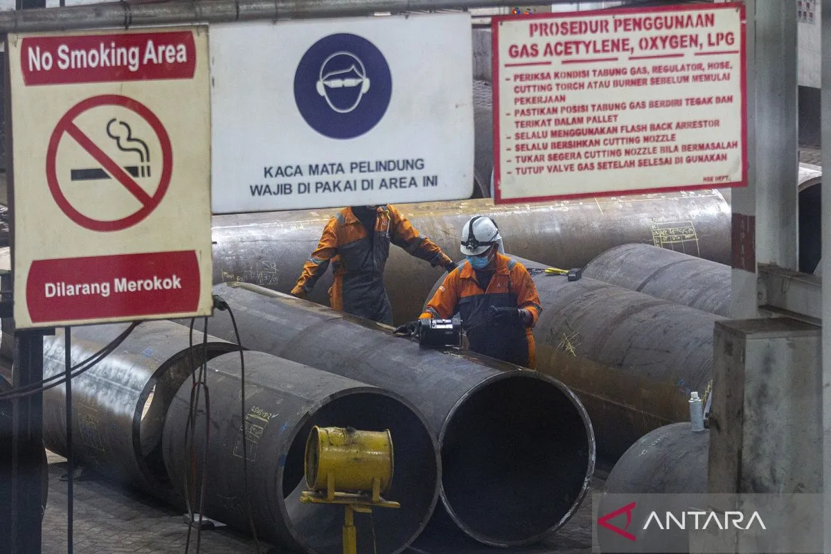 Pekerja menyelesaikan proses pemotongan pipa gas di pabrik produksi pipa gas PT Dwi Sumber Arca Waja Kura di Kawasan Industri Terpadu Kabil, Batam, Kepulauan Riau, Kamis (5/2/2026). SKK Migas mempertegas kewajiban pemanfaatan barang dan jasa dalam negeri di sektor hulu migas guna menekan impor serta meningkatkan Tingkat Komponen Dalam Negeri (TKDN) sebagai bagian dari penguatan kapasitas industri nasional, yang menyasar kontraktor kontrak kerja sama (K3S) dan pelaku usaha migas yang masih bergantung pada produk impor. ANTARA FOTO/Teguh Prihatna/bar