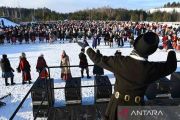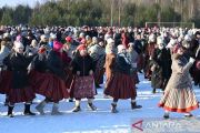 Sejumlah orang mengenakan pakaian tradisional saat ikut serta dalam festival tari musim dingin di Kohtla-Nomme, Estonia, Sabtu (7/2/2026). ANTARA FOTO/Xinhua/Sergei Stepanov/rwa.