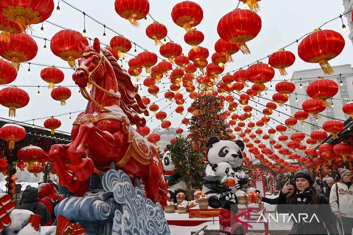 Pengunjung menyaksikan dekorasi perayaan tahun baru Imlek di Moscow, Russia, Senin (16/2/2026). ANTARA FOTO/Xinhua/Alexander Zemlianichenko Jr/rwa.