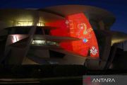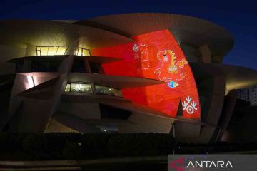 Museum Nasional Qatar memantulkan gambar bertema kuda api dalam rangka perayaan tahun baru Imlek di Doha, Qatar, Senin (16/2/2026). ANTARA FOTO/Xinhua/Nikku/rwa.