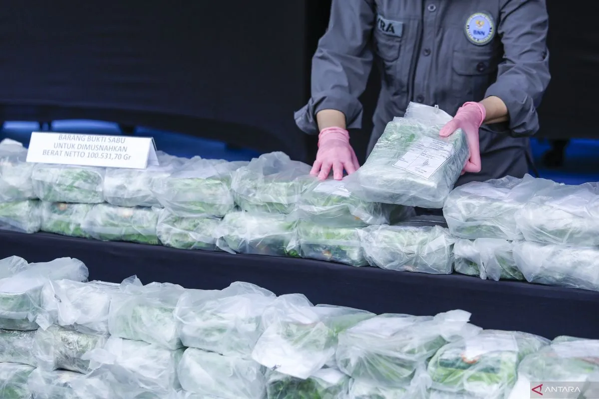 Petugas menata barang bukti narkotika sebelum di musnahkan di Kantor Pusat Badan Narkotika Nasional (BNN), Jakarta, Rabu (18/2/2026). BNN memusnahkan barang bukti sebanyak 100.531,70 gram sabu, 889 gram ganja, 990 mililiter cairan dan 953,30 gram padatan MDMB-4EN-PINACA hasil pengungkapan lima kasus tindak pidana narkotika serta mengamankan 10 orang tersangka. ANTARA FOTO/Asprilla Dwi Adha/foc.
