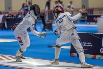 Asian Cadet and Junior Fencing Championship di Jakarta. Atlet anggar Korea Selatan Juah Lim (kiri) saling serang dengan atlet anggar Kazakhstan Daria Samodelkina (kanan) saat pertandingan kategori Cadet Womens Saber pada Asian Cadet and Junior Fencing Championship 2026 di Jakarta International Convention Center (JICC), Senayan, Jakarta, Jumat (20/2/2026). Indonesia menjadi tuan rumah penyelenggaraan Asian Cadet and Junior Fencing Championship 2026 yang diikuti sebanyak 801 atlet dari 26 negara Asia dan Oceania dengan mempertandingkan nomor sabel, degen dan floret baik individu maupun beregu putra dan putri yang berlangsung pada 20-27 Februari di Jakarta. ANTARA FOTO/Bayu Pratama S/wsj.
