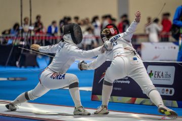 Sejumlah atlet anggar saling serang saat pertandingan kategori Cadet Womens Saber pada Asian Cadet and Junior Fencing Championship 2026 di Jakarta International Convention Center (JICC), Senayan, Jakarta, Jumat (20/2/2026). Indonesia menjadi tuan rumah penyelenggaraan Asian Cadet and Junior Fencing Championship 2026 yang diikuti sebanyak 801 atlet dari 26 negara Asia dan Oceania dengan mempertandingkan nomor sabel, degen dan floret baik individu maupun beregu putra dan putri yang berlangsung pada 20-27 Februari di Jakarta. ANTARA FOTO/Bayu Pratama S/wsj.