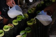 Pekerja menuangkan santan ke dalam bambu berisi adonan lemang sebelum dibakar di tempat pembuatan lemang milik Iwan Flamboyan di Gang Selamat 1, Jalan HRA Rahman, Pontianak, Kalimantan Barat, Selasa (23/2/2026). Perajin mengaku mampu memproduksi 150-200 batang lemang per hari untuk kebutuhan berbuka puasa dengan harga jual Rp30 ribu hingga Rp40 ribu per batang tergantung ukuran. ANTARA FOTO/Jessica Wuysang/wsj.