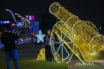 Seorang pengunjung berpose untuk foto dengan instalasi lampu hias berbentuk meriam di Doha, Qatar, Jumat (27/2/2026). Lampu hias dengan beragam bentuk itu terpasang di sejumlah sudut Kota Doha selama bulan Ramadhan. ANTARA FOTO/Xinhua/Nikku/tom.