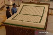 Pengunjung melintas di depan mushaf kitab suci Al Quran berukuran jumbo 3x2 meter di Masjid Raya Sheikh Zayed Solo, Jawa Tengah, Sabtu (28/2/2026). Mushaf tulis tangan karya Universitas Sains Al-Qur'an (UNSIQ) Wonosobo itu merupakan pemberian Presiden ke-7 RI Joko Widodo kepada pengurus masjid setempat untuk dipamerkan sebagai daya tarik bagi pengunjung dan wisatawan. ANTARA FOTO/Maulana Surya/tom.
